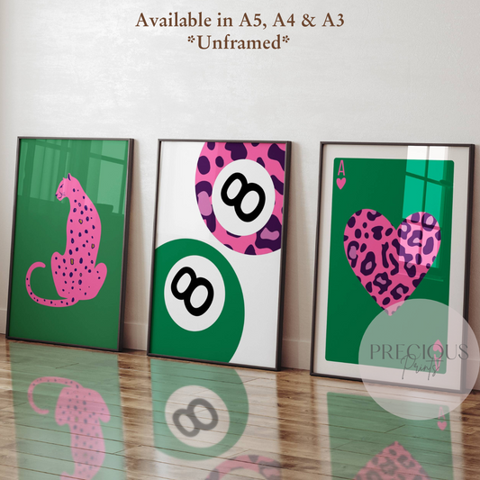 Set of 3 Green Pink Trendy Preppy Prints Bow Leopard Print Wall Art A5 A4 A3