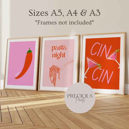 Set of 3 Cin cin Pasta Night Kitchen Bar Trendy Art Modern Print Preppy