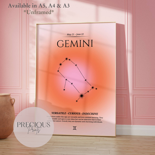 Gemini Zodiac Print / Preppy Trendy Wall Art Poster / A5 A4 A3 Unframed Pink