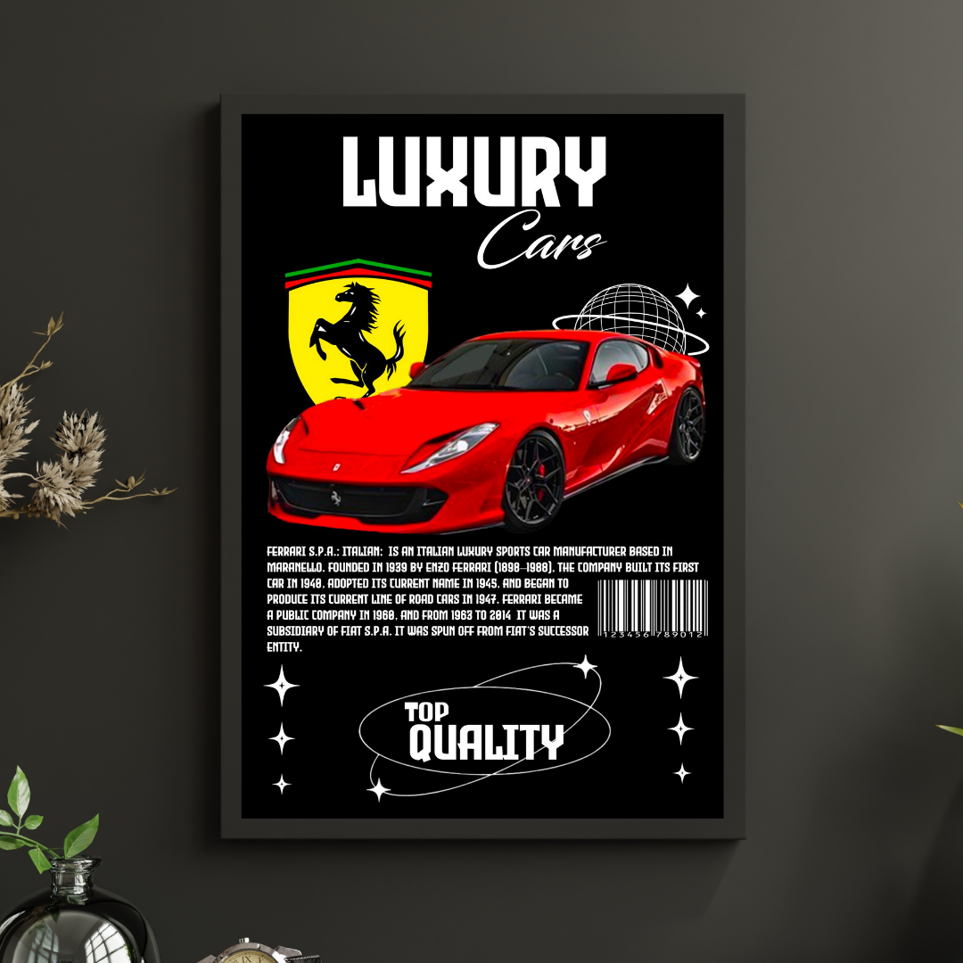 Capture the thrill of the road with this Red Ferrari S.P.A Italian Sports Car poster, available in A4 and A3 sizes. Printed on premium paper without a frame, it offers a sleek, modern look perfect for any car enthusiast’s space. Enjoy fast, free delivery across the UK and bring dynamic style and luxury into your home or office effortlessly.