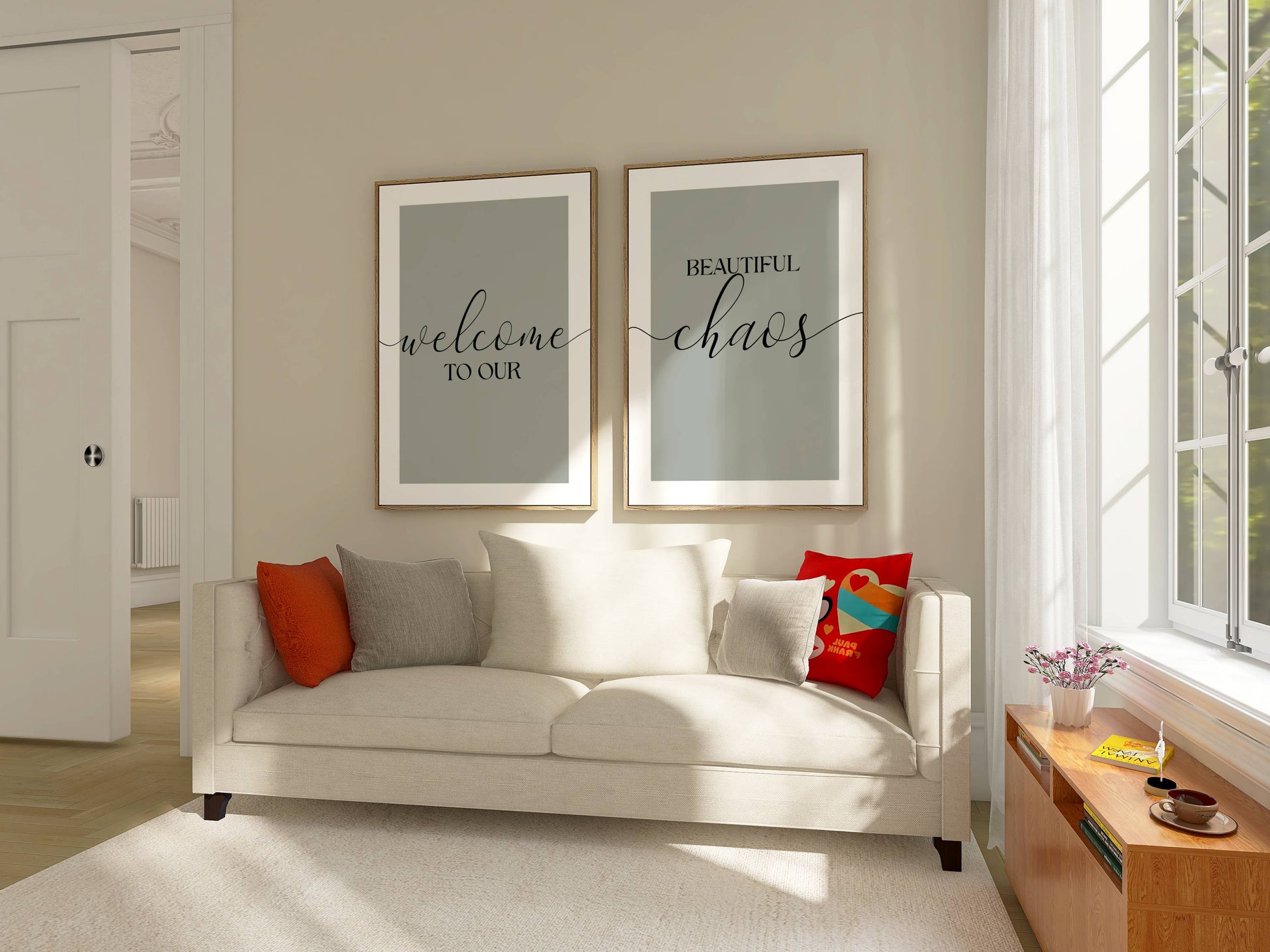 Add a splash of charm with this set of 2 green living room posters, perfect for brightening your space with playful vibes. Featuring the phrase "Welcome to Our Beautiful Chaos," these unframed prints come in A5, A4, and A3 sizes, letting you choose the ideal fit for your wall. Celebrate life’s messiness with a fun and heartfelt touch that makes your living area uniquely inviting.
