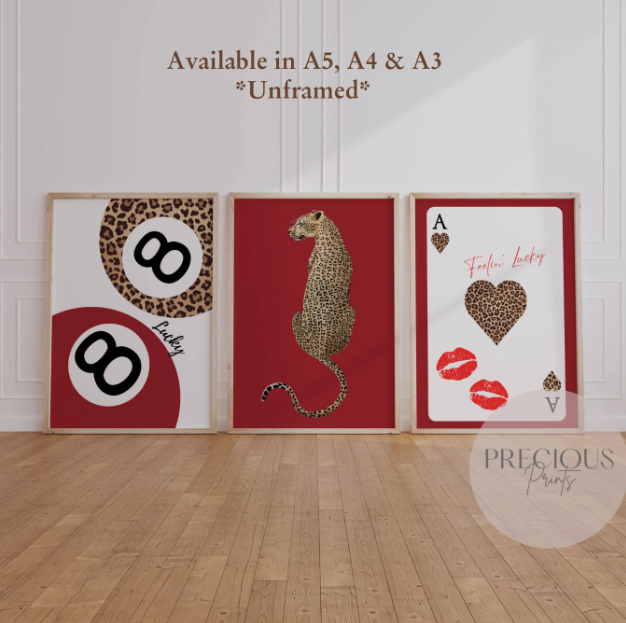Set of 3 Red Trendy Preppy Prints Cheetah Leopard Eclectic Wall Art